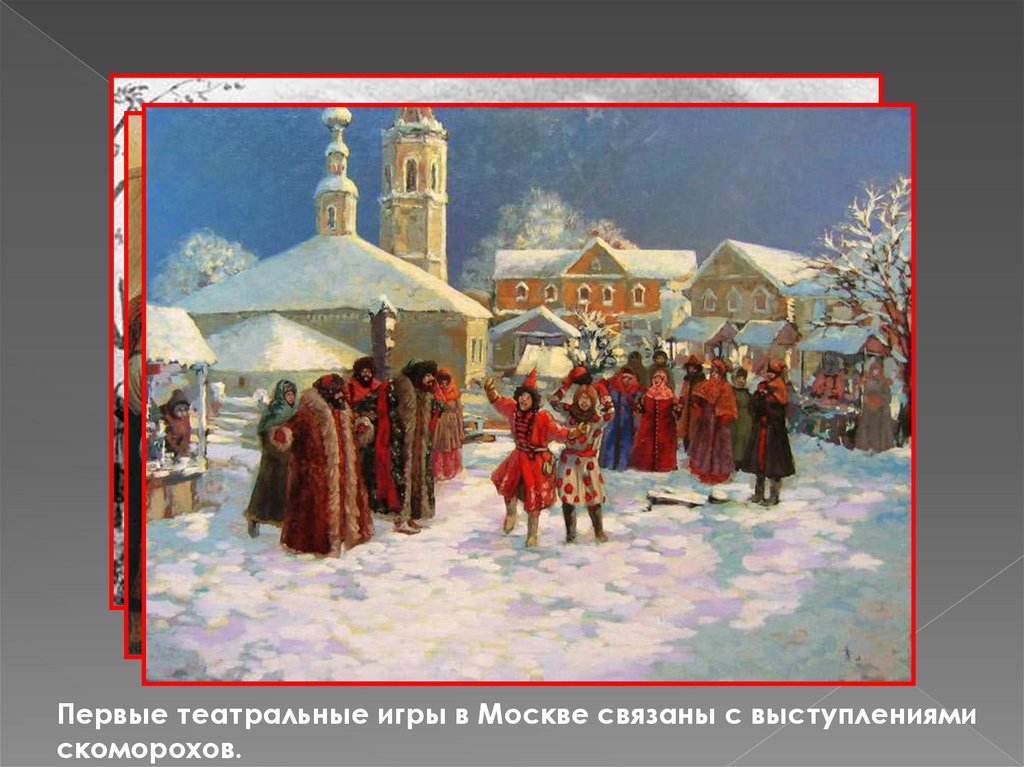 Первые театральные игры в Москве связаны с выступлениямискоморохов.