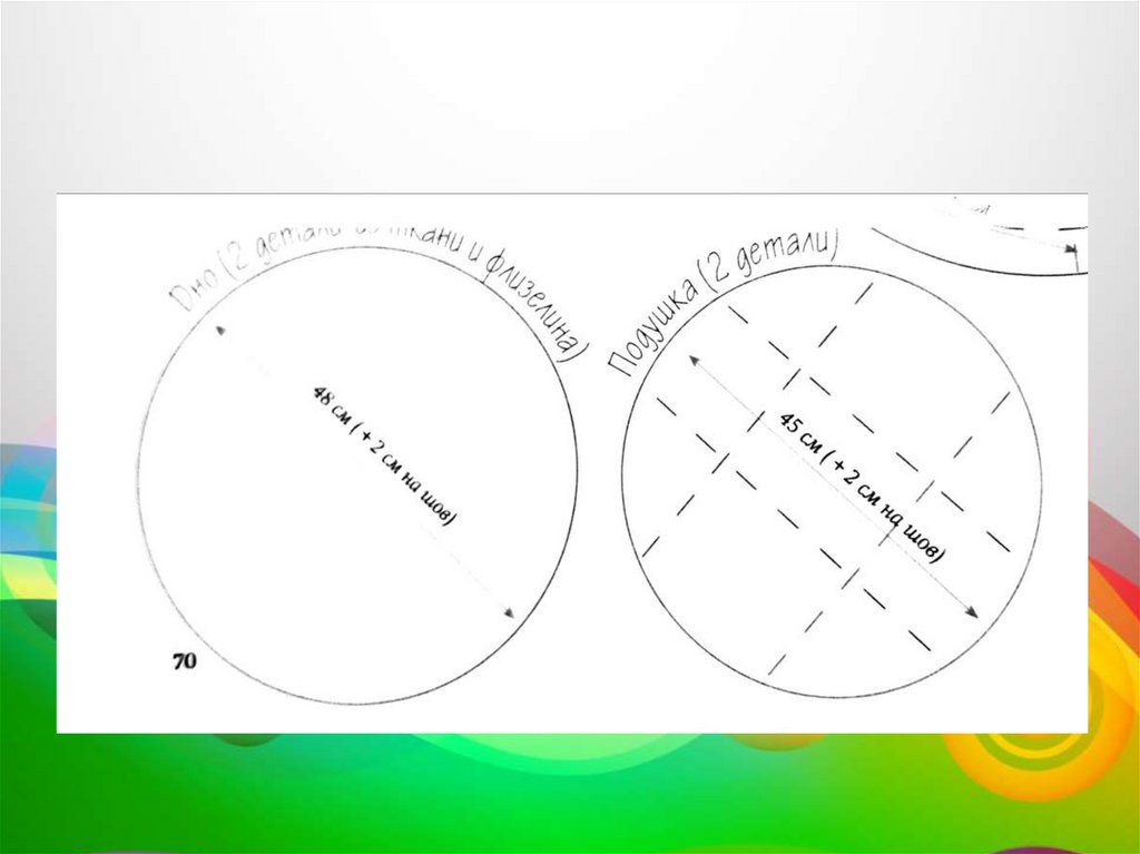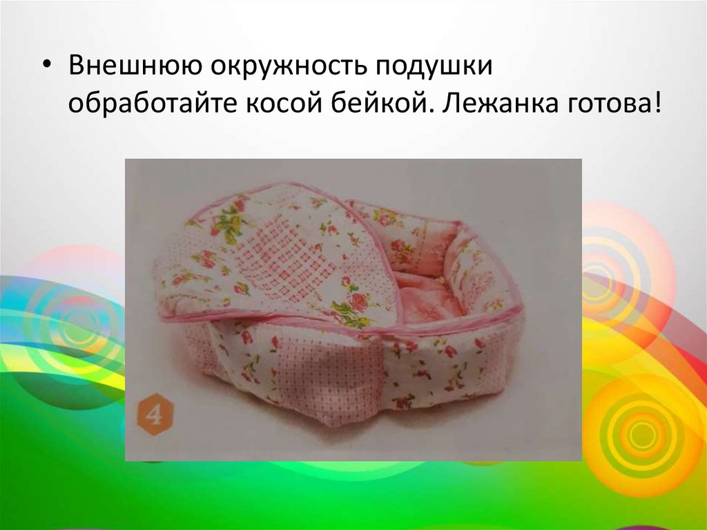 • Внешнюю окружность подушкиобработайте косой бейкой. Лежанка готова!