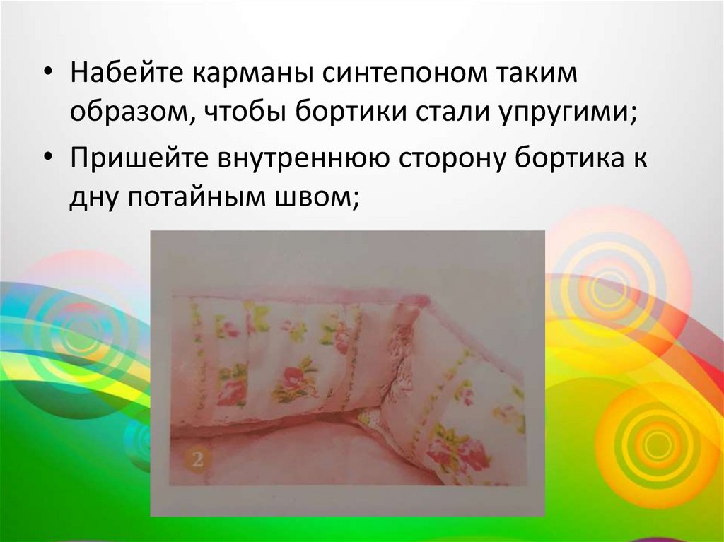 • Набейте карманы синтепоном такимобразом, чтобы бортики стали упругими;