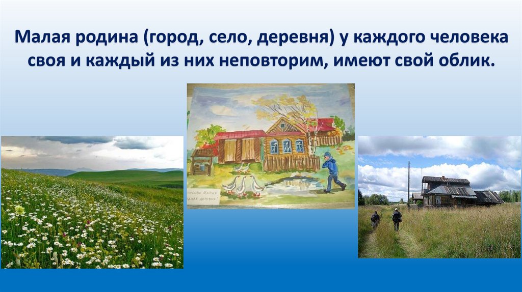 Малая родина (город, село, деревня) у каждого человекасвоя и каждый из них неповторим, имеют свой облик.