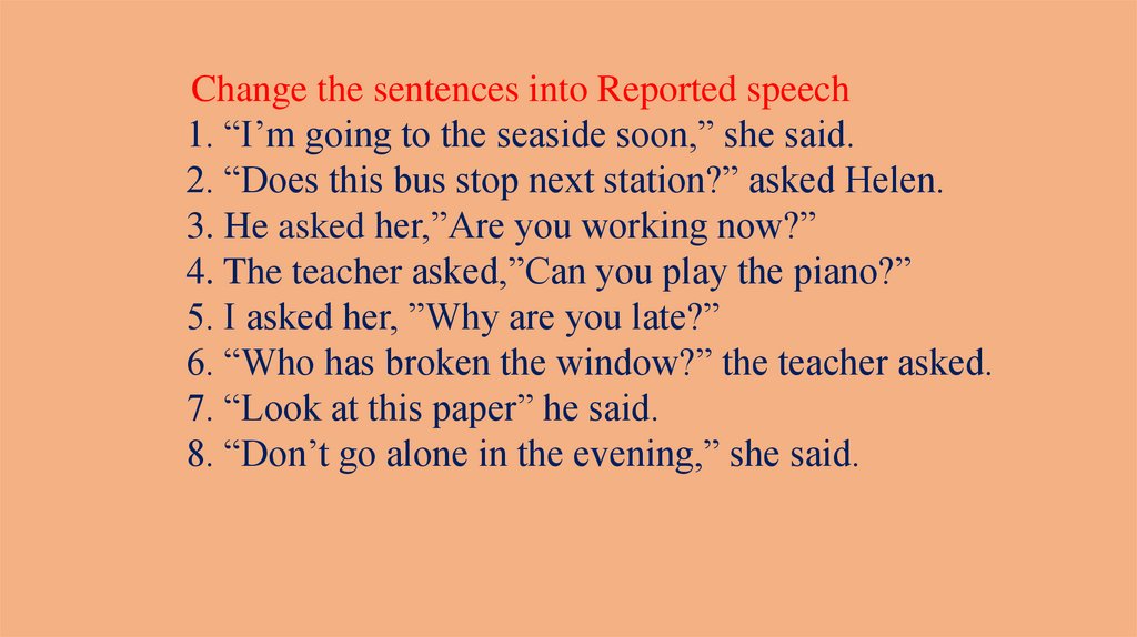 Change the sentences into Reported speech1. “I’m going to the seaside soon,” she said.