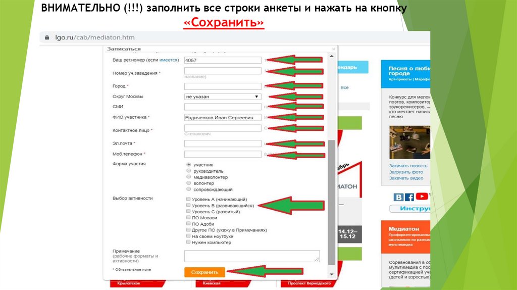 ВНИМАТЕЛЬНО (!!!) заполнить все строки анкеты и нажать на кнопку«Сохранить»