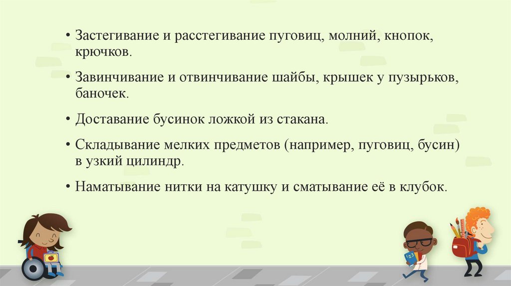 • Застегивание и расстегивание пуговиц, молний, кнопок,крючков.
