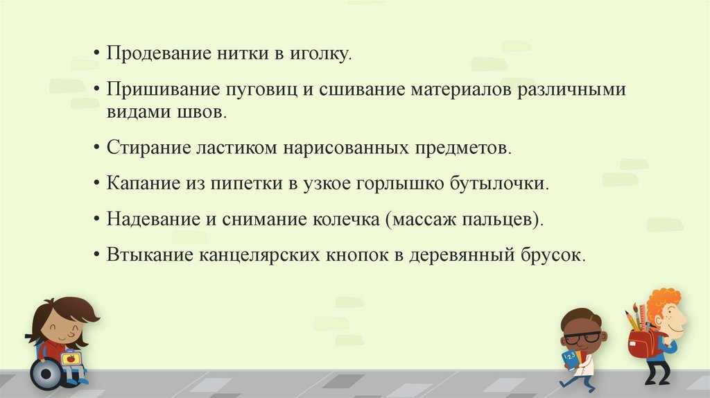 • Продевание нитки в иголку.• Пришивание пуговиц и сшивание материалов различными