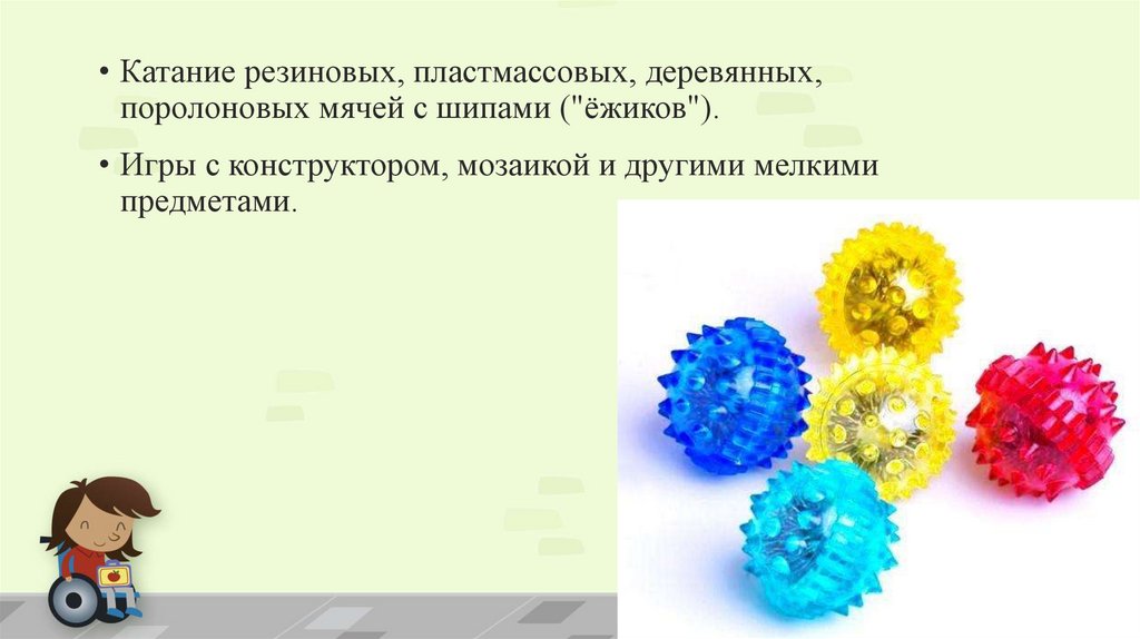 • Катание резиновых, пластмассовых, деревянных,поролоновых мячей с шипами ("ёжиков").
