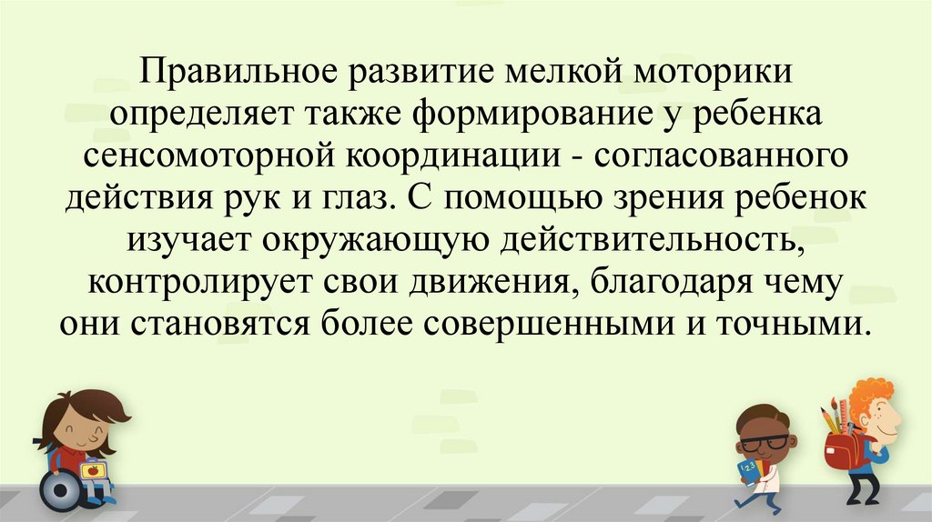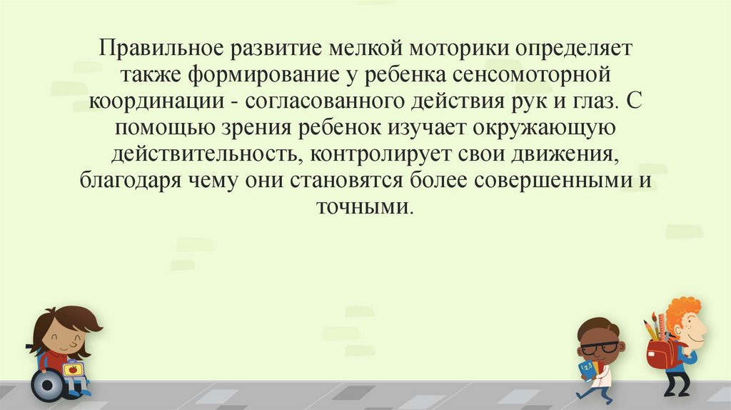 Правильное развитие мелкой моторики определяеттакже формирование у ребенка сенсомоторной