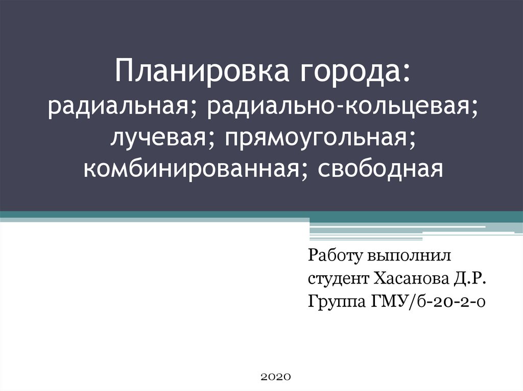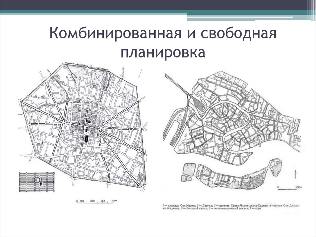 1. Планировка города: радиальная; радиально-кольцевая; лучевая; прямоугольная; комбинированная; свободная