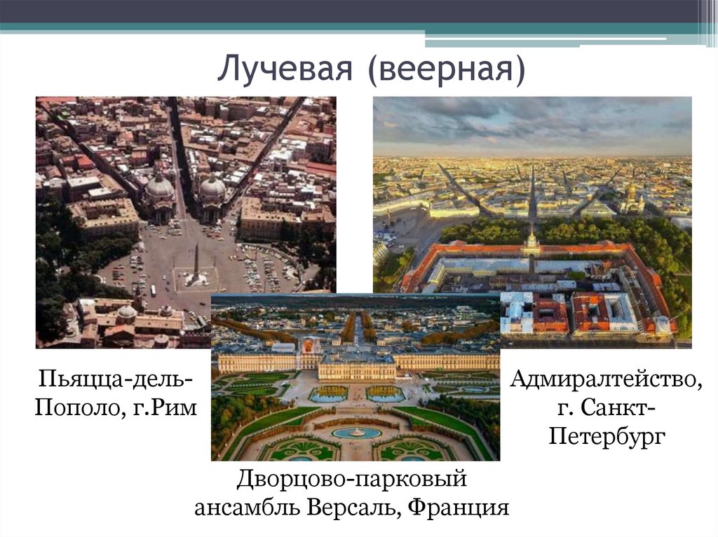 Планировка города: радиальная; радиально-кольцевая; лучевая; прямоугольная; комбинированная; свободная
