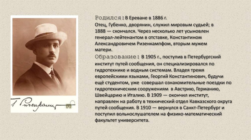 Родился:В Ереване в 1886 г.Отец, Губенко, дворянин, служил мировым судьей; в