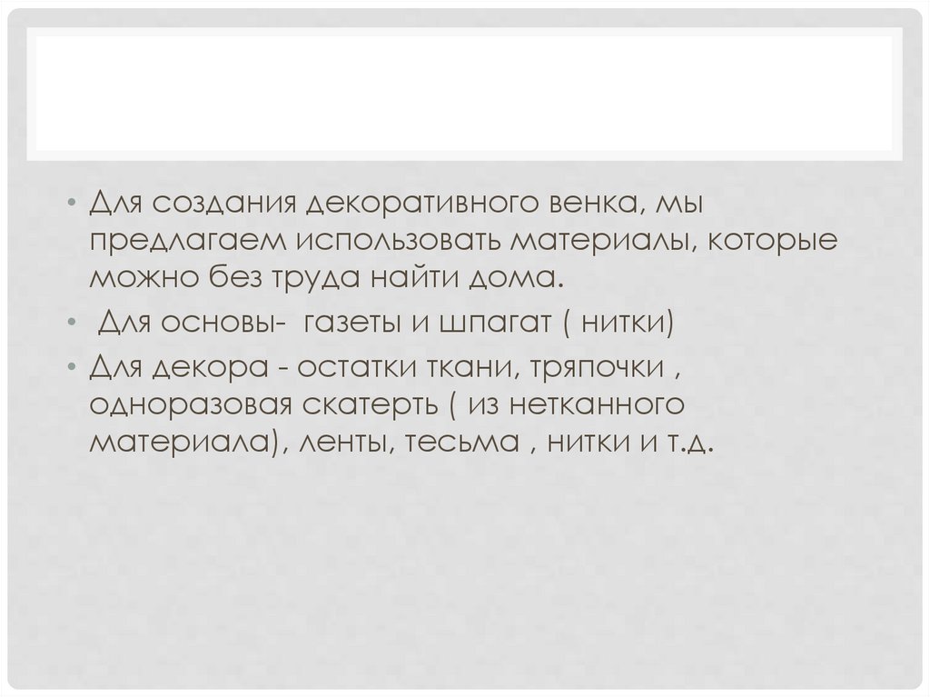 • Для создания декоративного венка, мыпредлагаем использовать материалы, которые