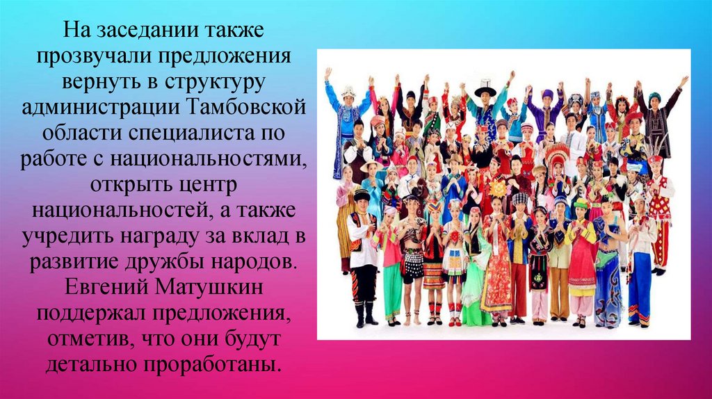 • Дружбу народов на территории региона нужно постоянноукреплять. Для нас очень важно, чтобы в Тамбовской области