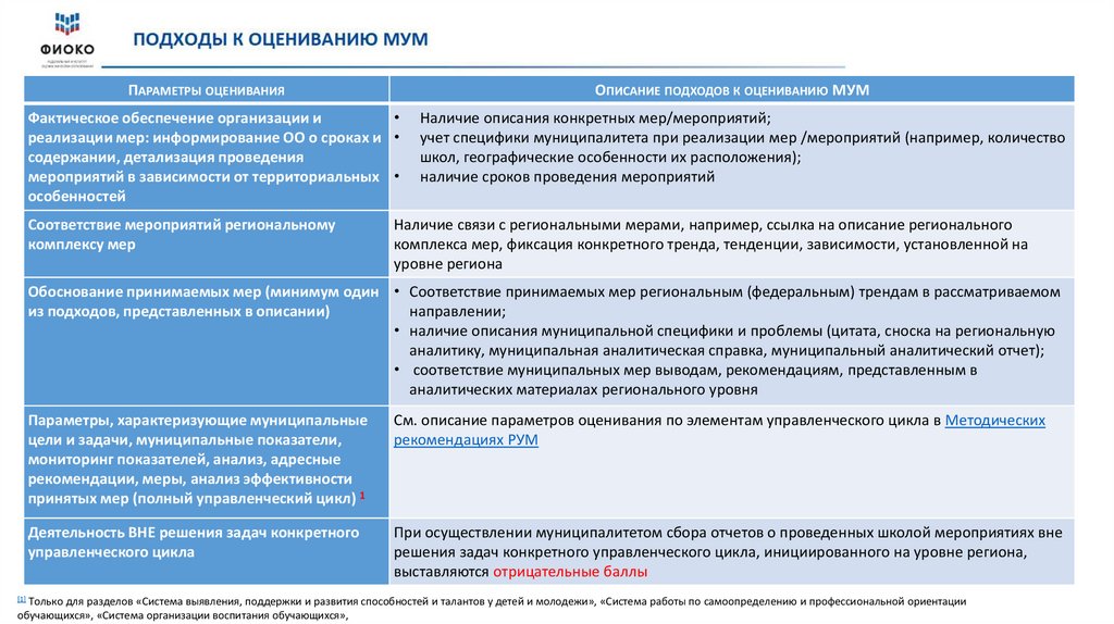 ПАРАМЕТРЫ ОЦЕНИВАНИЯОПИСАНИЕ ПОДХОДОВ К ОЦЕНИВАНИЮ МУМ