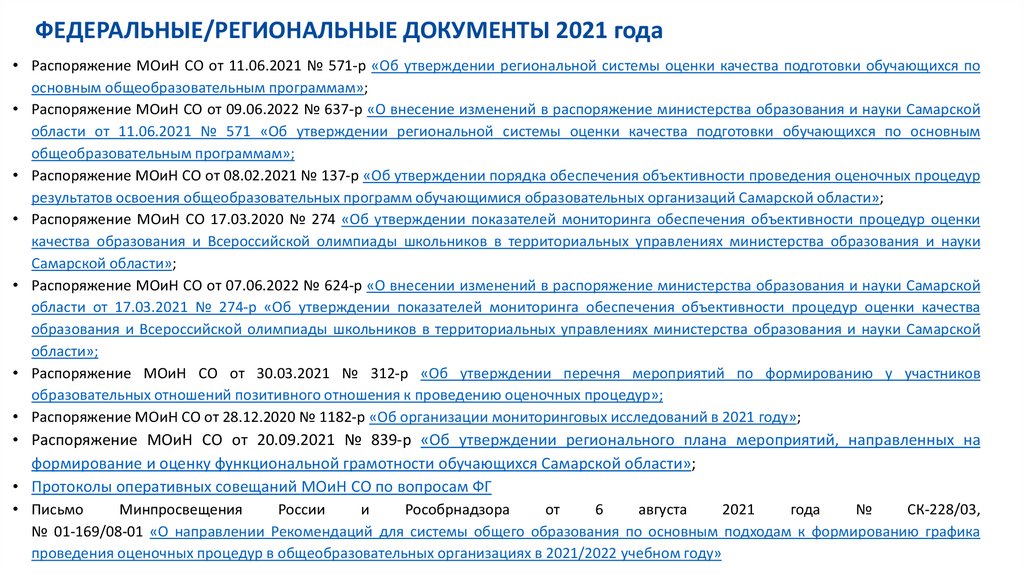 • Распоряжение МОиН СО от 11.06.2021 № 571-р «Об утверждении региональной системы оценки качества подготовки обучающихся поосновным общеобразовательным программам»;