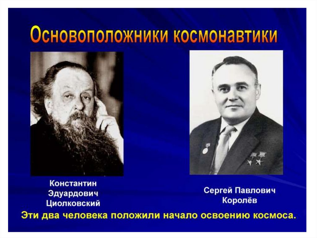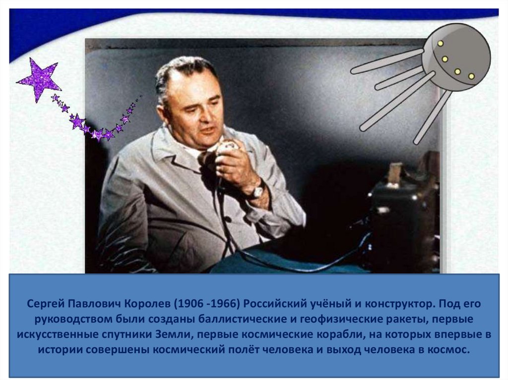 Сергей Павлович Королев (1906 -1966) Российский учёный и конструктор. Под егоруководством были созданы баллистические и геофизические ракеты, первые