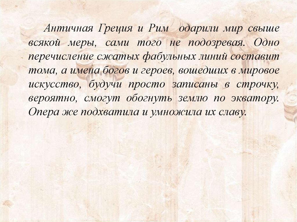• Обращаясь к античным сюжетам, композиторы не ставили своейзадачей показать и рассказать слушателям реалии той эпохи,