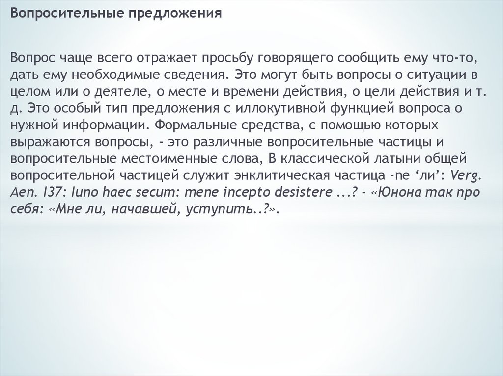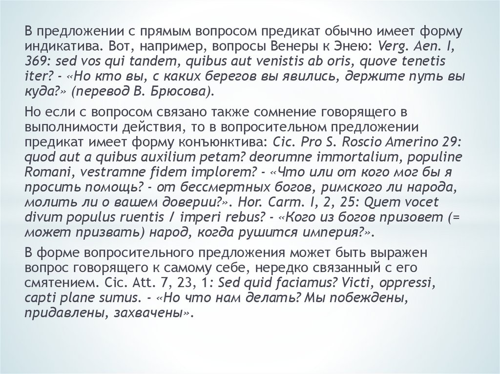 В предложении с прямым вопросом предикат обычно имеет формуиндикатива. Вот, например, вопросы Венеры к Энею: Verg. Aen. I,