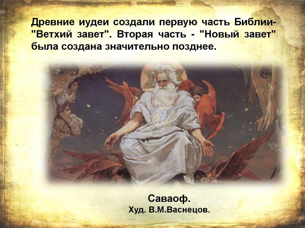 Древние иудеи создали первую часть Библии"Ветхий завет". Вторая часть - "Новый завет"была создана значительно позднее.