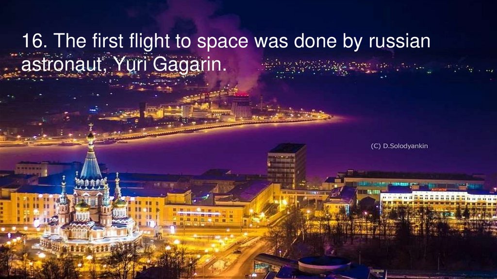 16. The first flight to space was done by russianastronaut, Yuri Gagarin.
