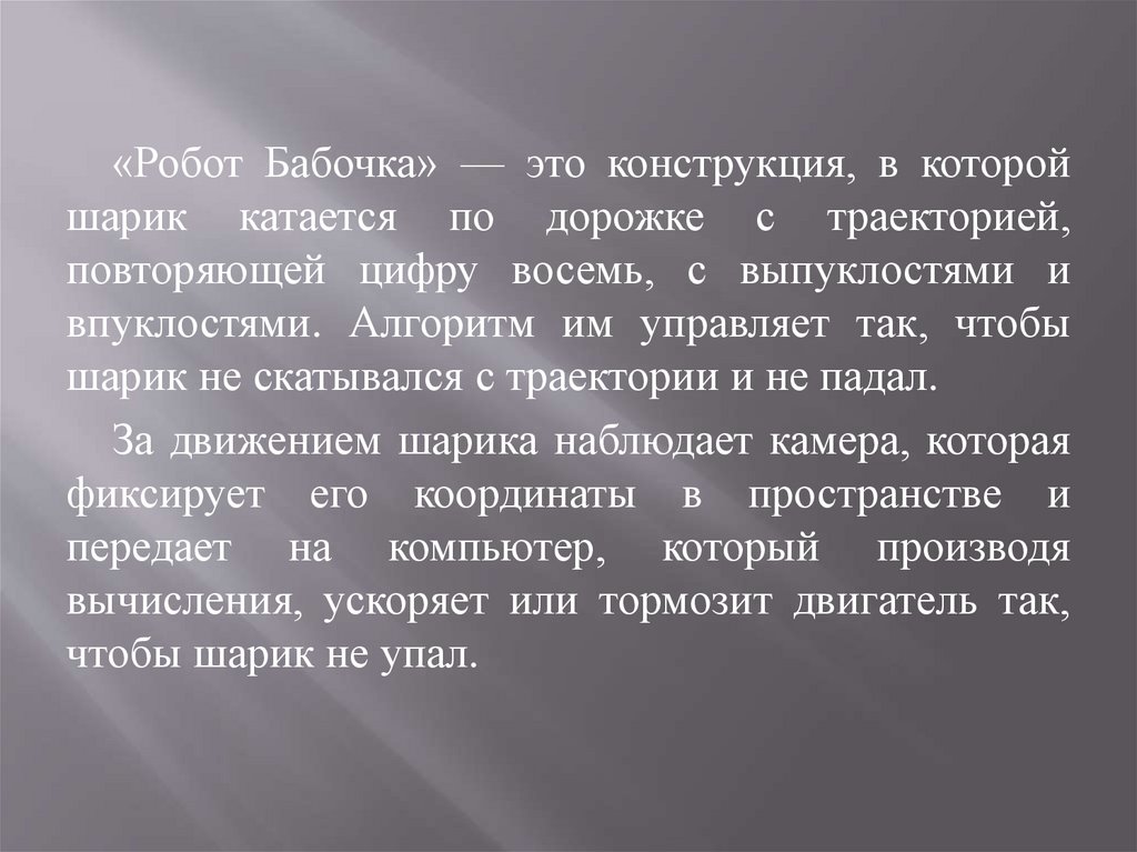 «Робот Бабочка» — это конструкция, в которойшарик катается по дорожке с траекторией,