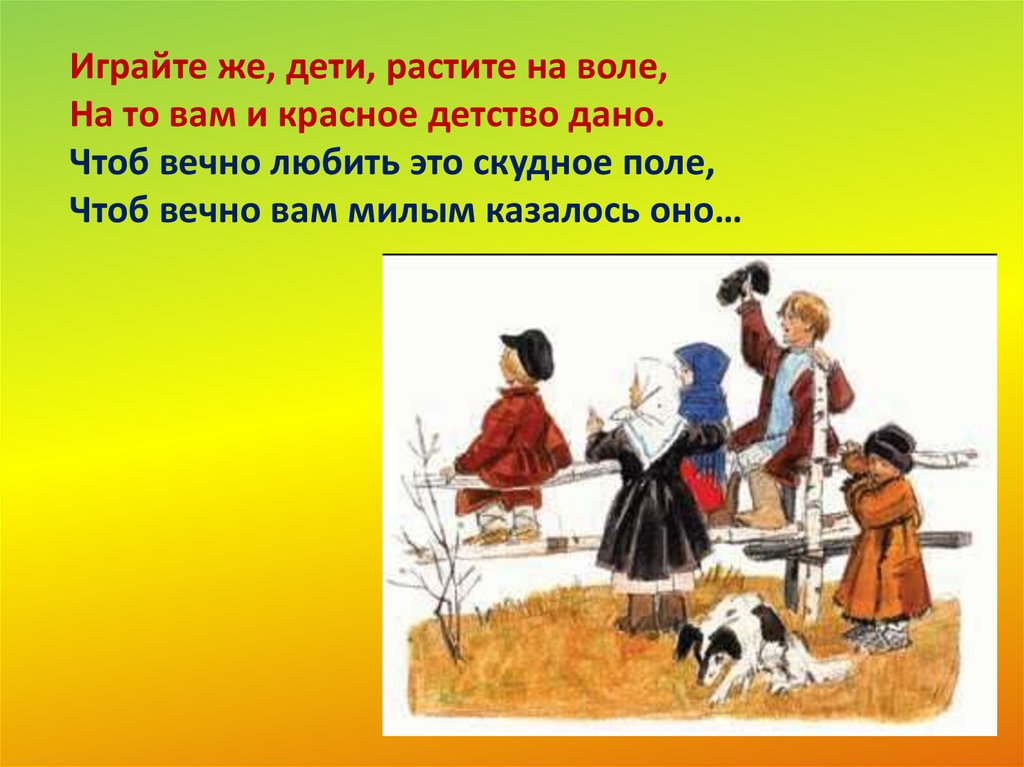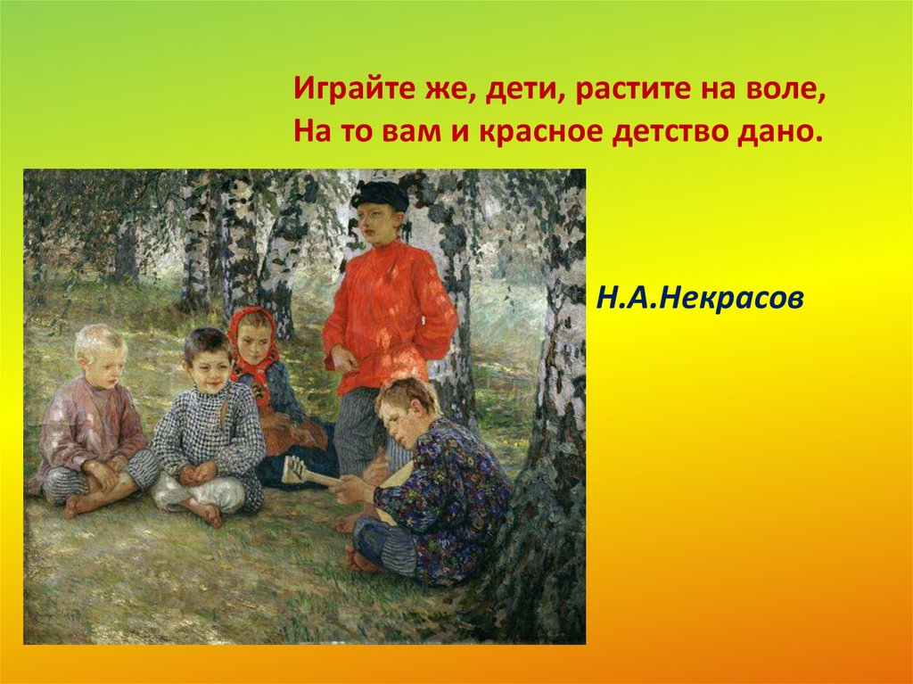 Играйте же, дети, растите на воле,На то вам и красное детство дано.