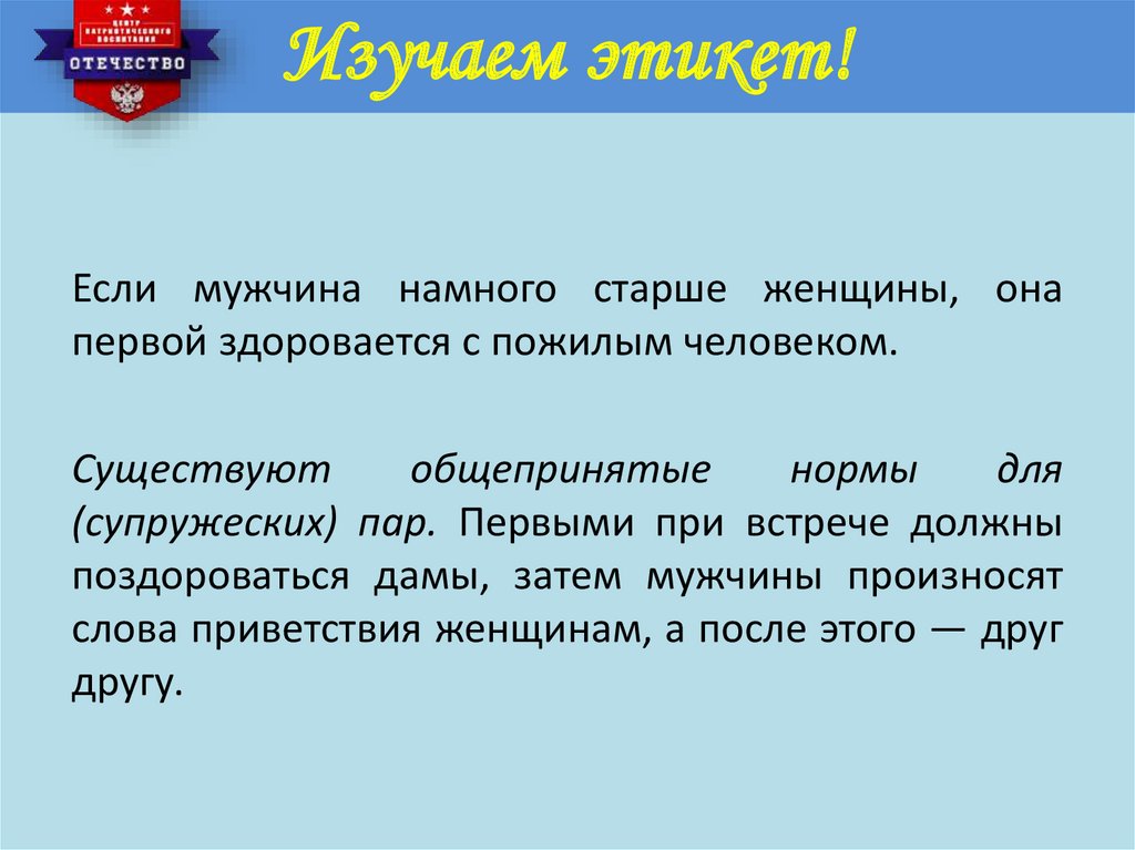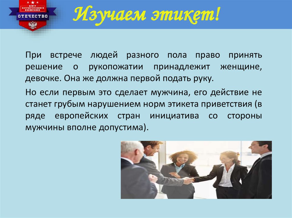 Изучаем этикет!При встрече людей разного пола право принять