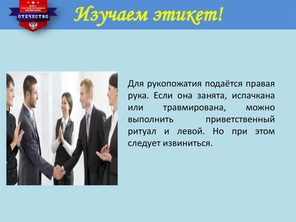 Изучаем этикет!Для рукопожатия подаётся правая