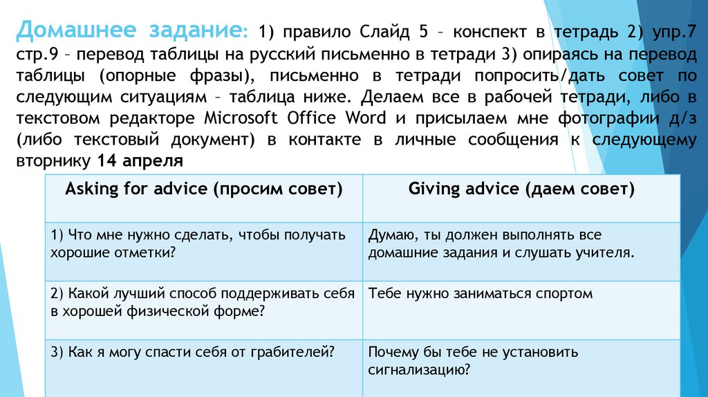 таблицы (опорные фразы), письменно в тетради попросить/дать совет по