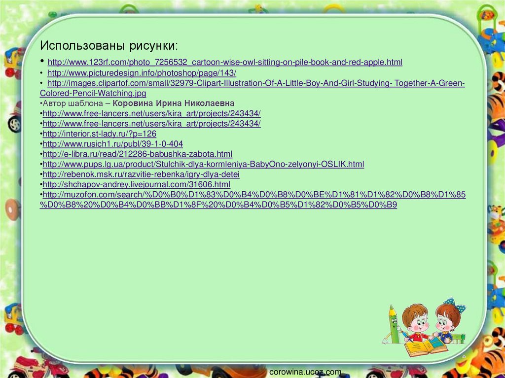 Использованы рисунки:• http://www.123rf.com/photo_7256532_cartoon-wise-owl-sitting-on-pile-book-and-red-apple.html