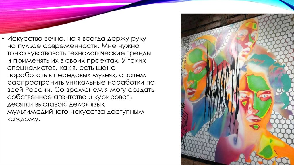 • Искусство вечно, но я всегда держу рукуна пульсе современности. Мне нужно