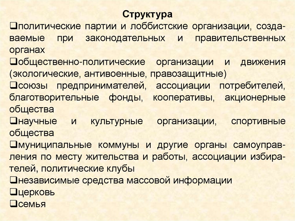 Структураполитические партии и лоббистские организации, создаваемые при законодательных и правительственных