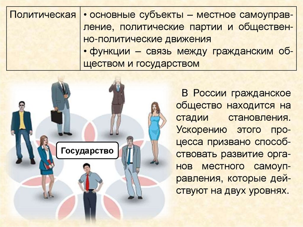 Политическая • основные субъекты – местное самоуправление, политические партии и общественно-политические движения• функции – связь между гражданским обществом и государством