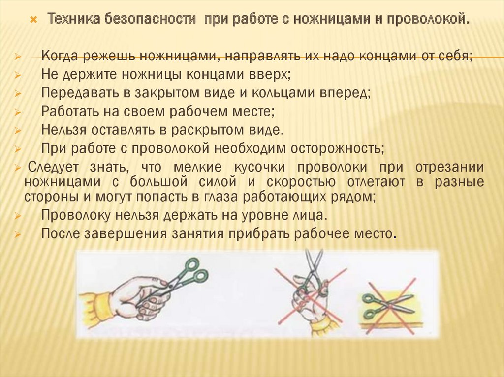 Техника безопасности при работе с ножницами и проволокой.Когда режешь ножницами, направлять их надо концами от себя;
