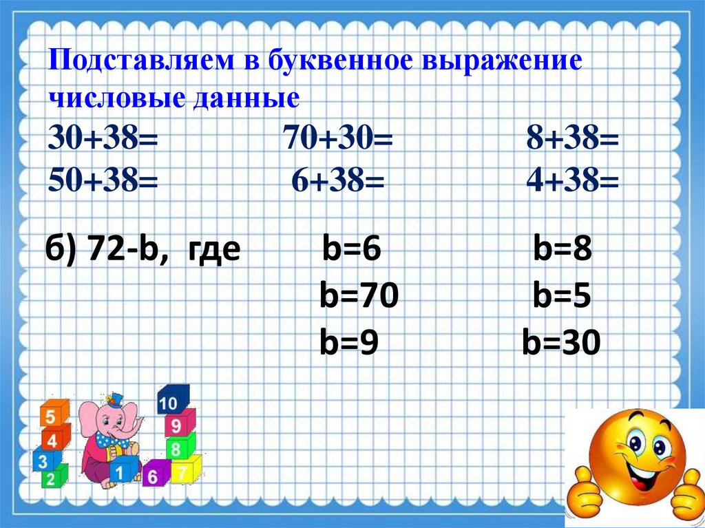 Решите буквенные выраженияа) m+30, где m=30