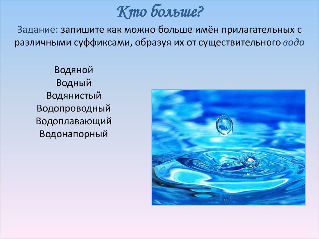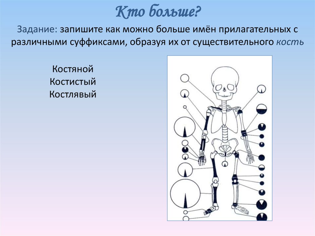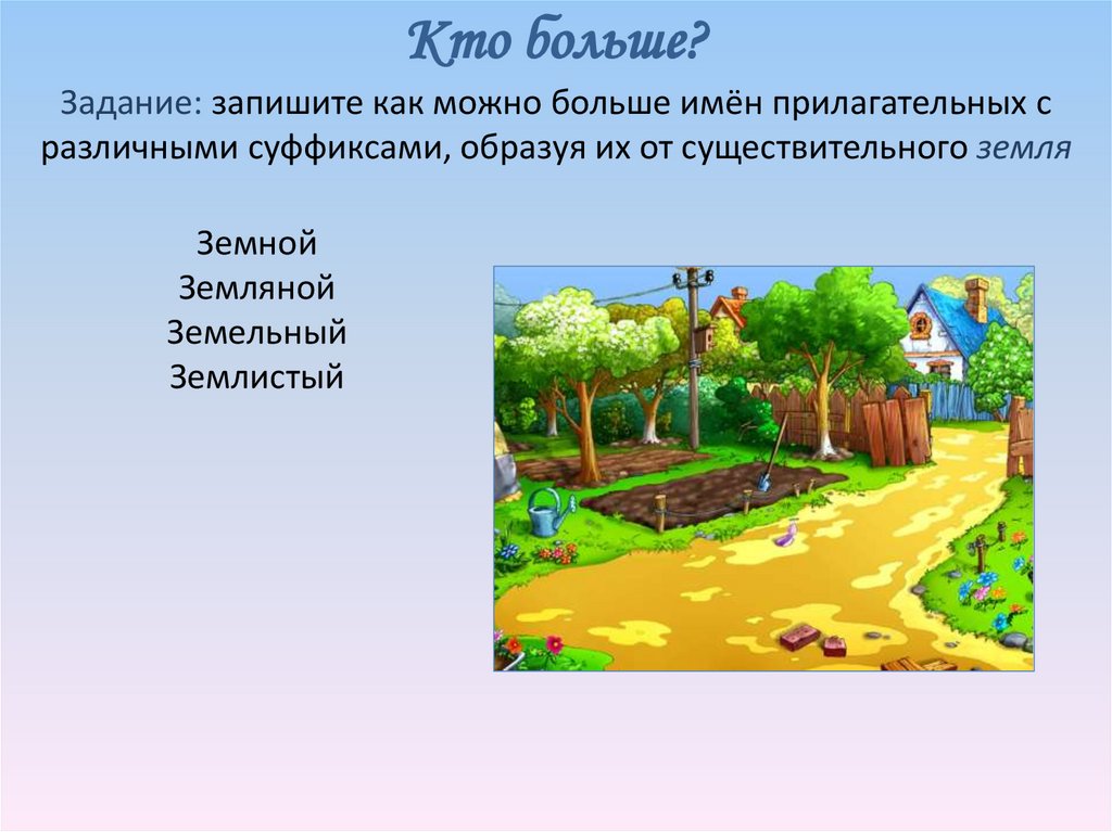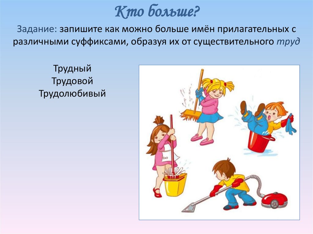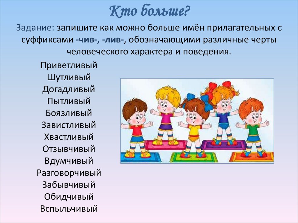 Кто больше?Задание: запишите как можно больше имён прилагательных с