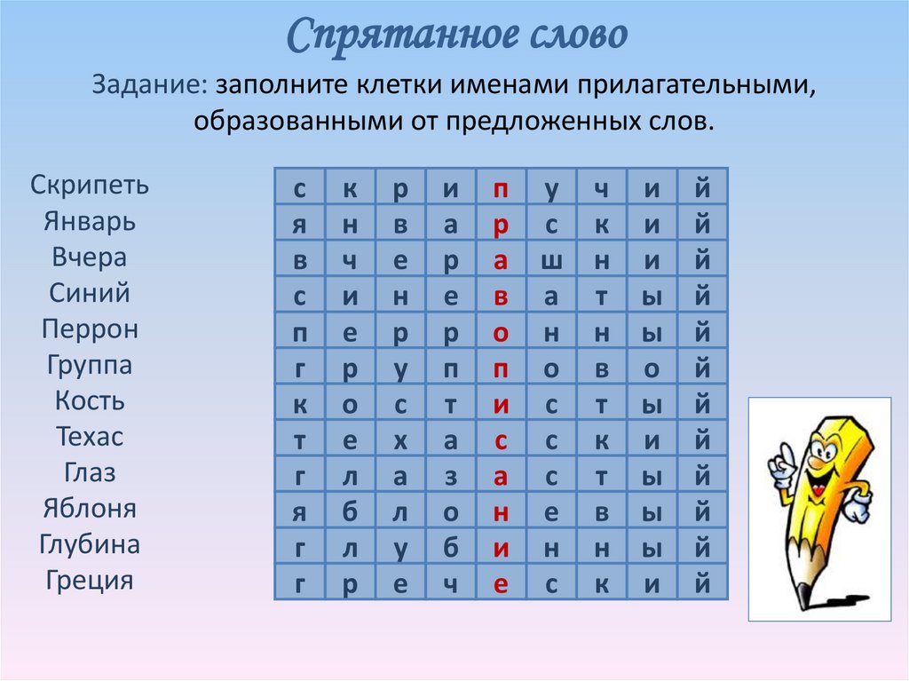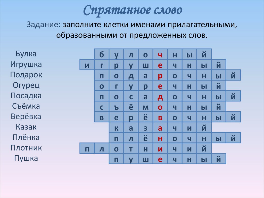 Спрятанное словоЗадание: заполните клетки именами прилагательными,