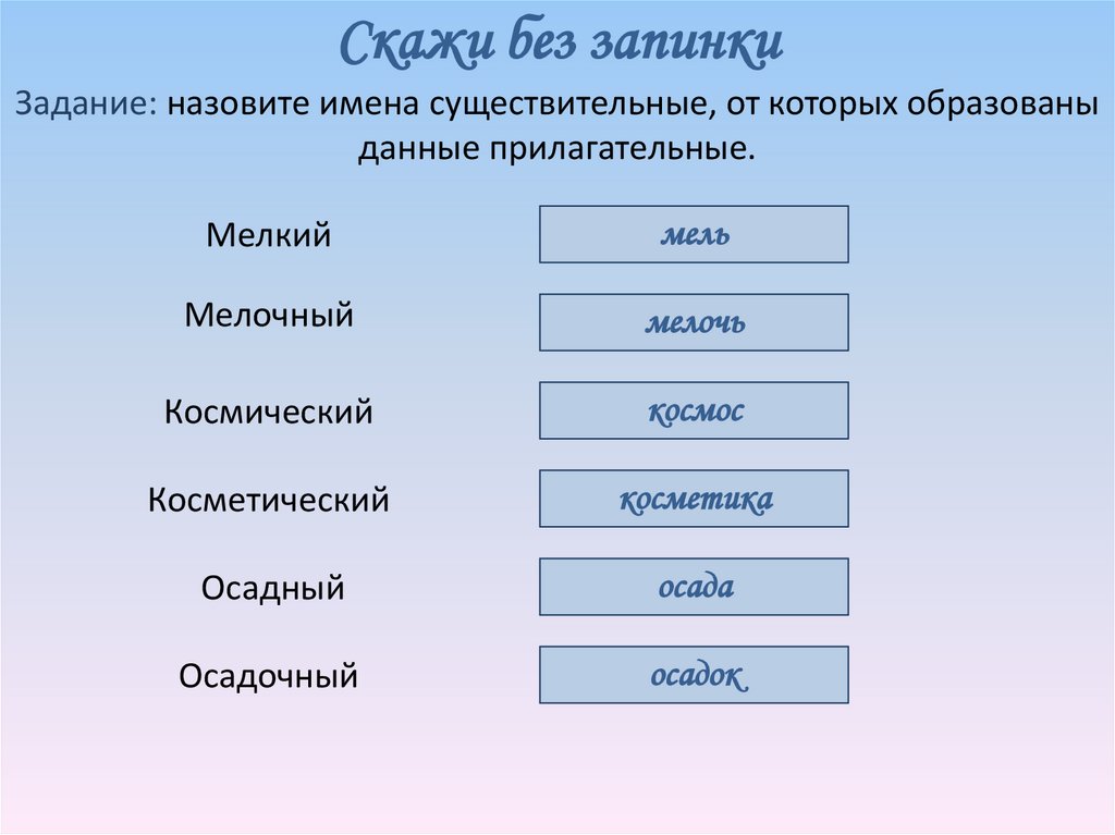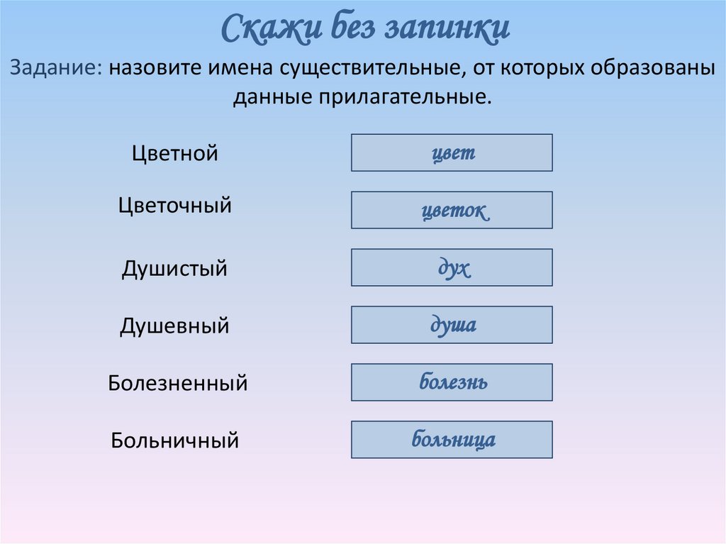 Скажи без запинкиЗадание: назовите имена существительные, от которых образованы