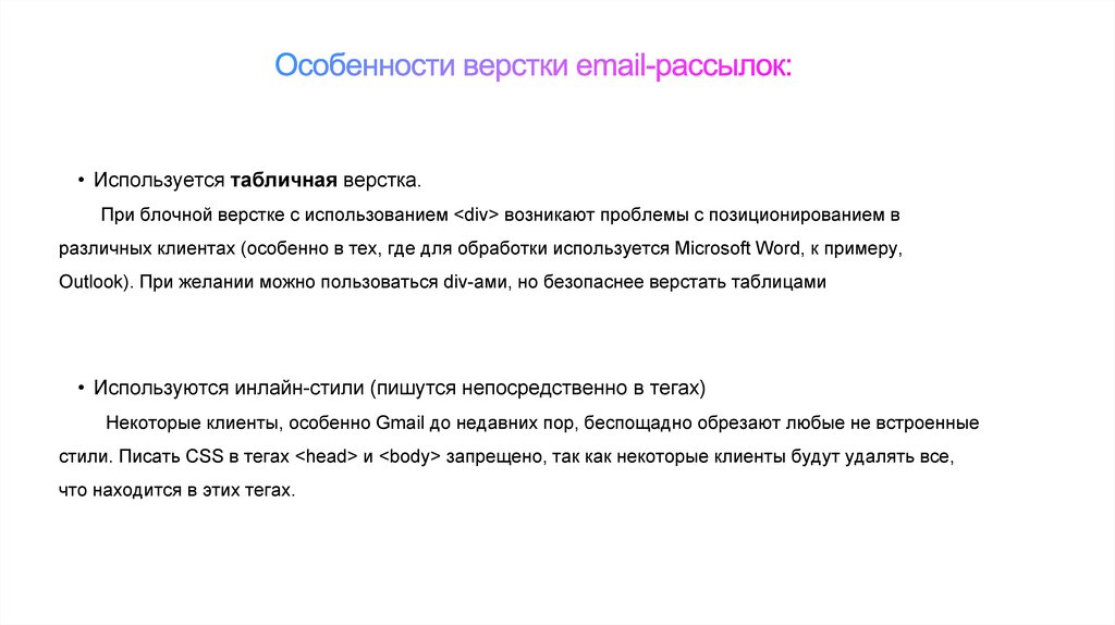 стили. Писать CSS в тегах <head> и <body> запрещено, так как некоторые клиенты будут удалять все,