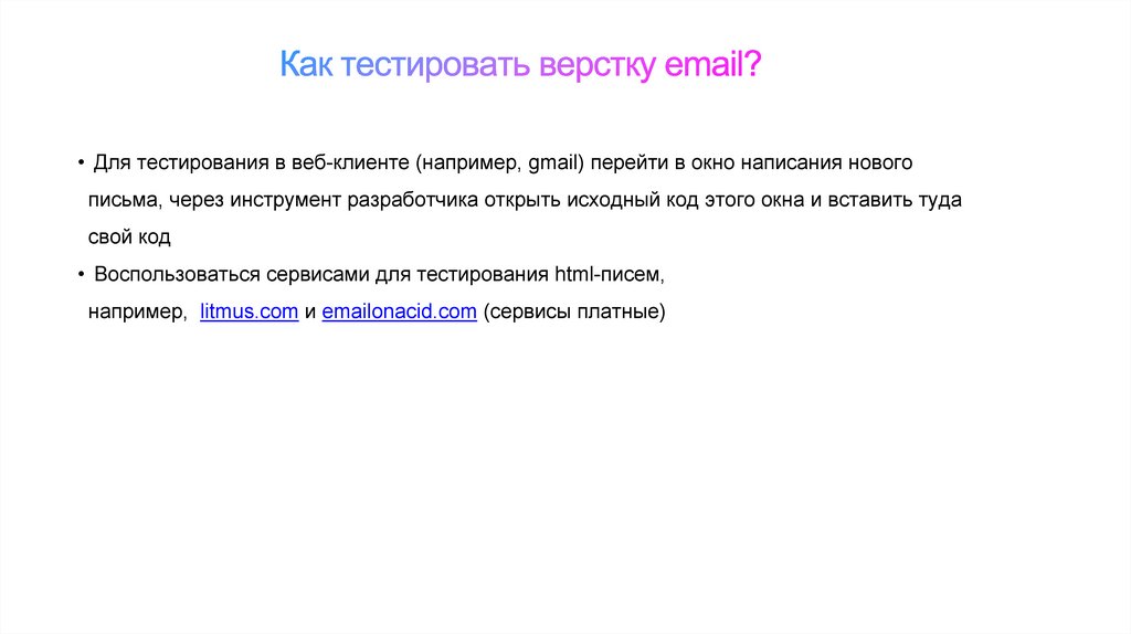 • Для тестирования в веб-клиенте (например, gmail) перейти в окно написания новогописьма, через инструмент разработчика открыть исходный код этого окна и вставить туда