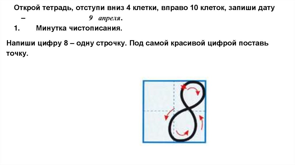 Открой тетрадь, отступи вниз 4 клетки, вправо 10 клеток, запиши дату–