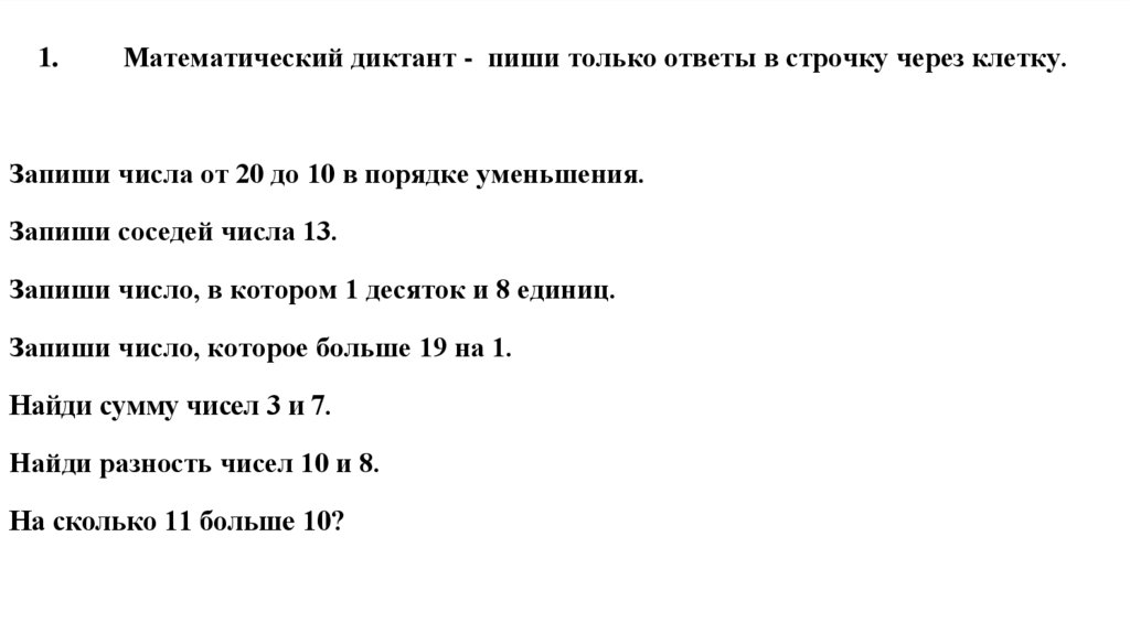 1.Математический диктант - пиши только ответы в строчку через клетку.
