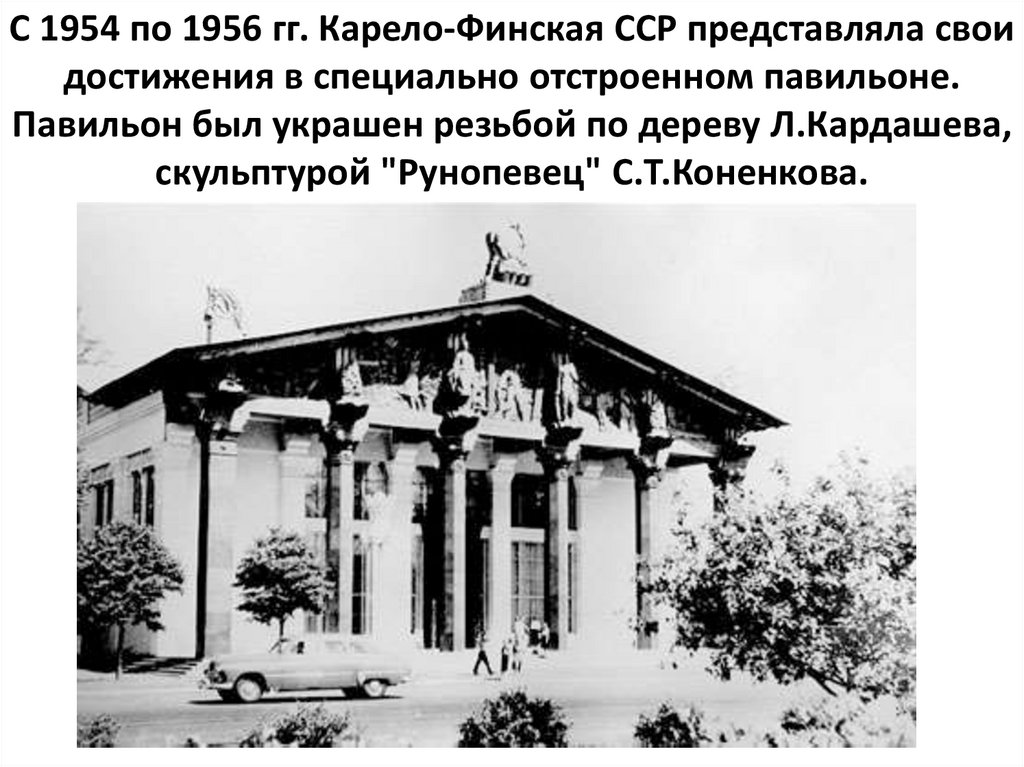 С 1954 по 1956 гг. Карело-Финская ССР представляла своидостижения в специально отстроенном павильоне.