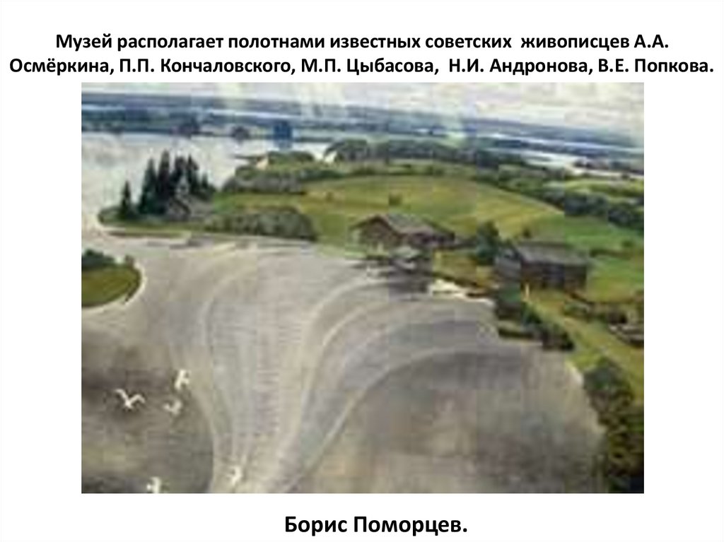 Музей располагает полотнами известных советских живописцев А.А.Осмёркина, П.П. Кончаловского, М.П. Цыбасова, Н.И. Андронова, В.Е. Попкова.