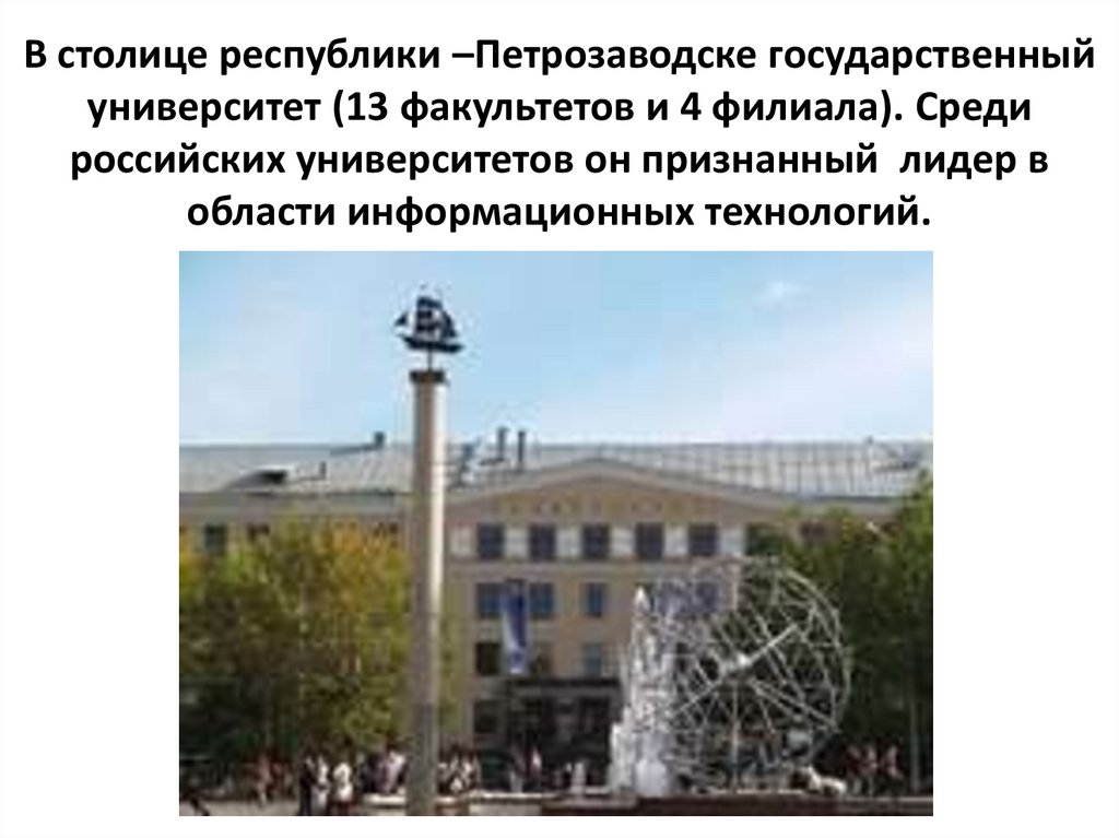 В столице республики –Петрозаводске государственныйуниверситет (13 факультетов и 4 филиала). Среди