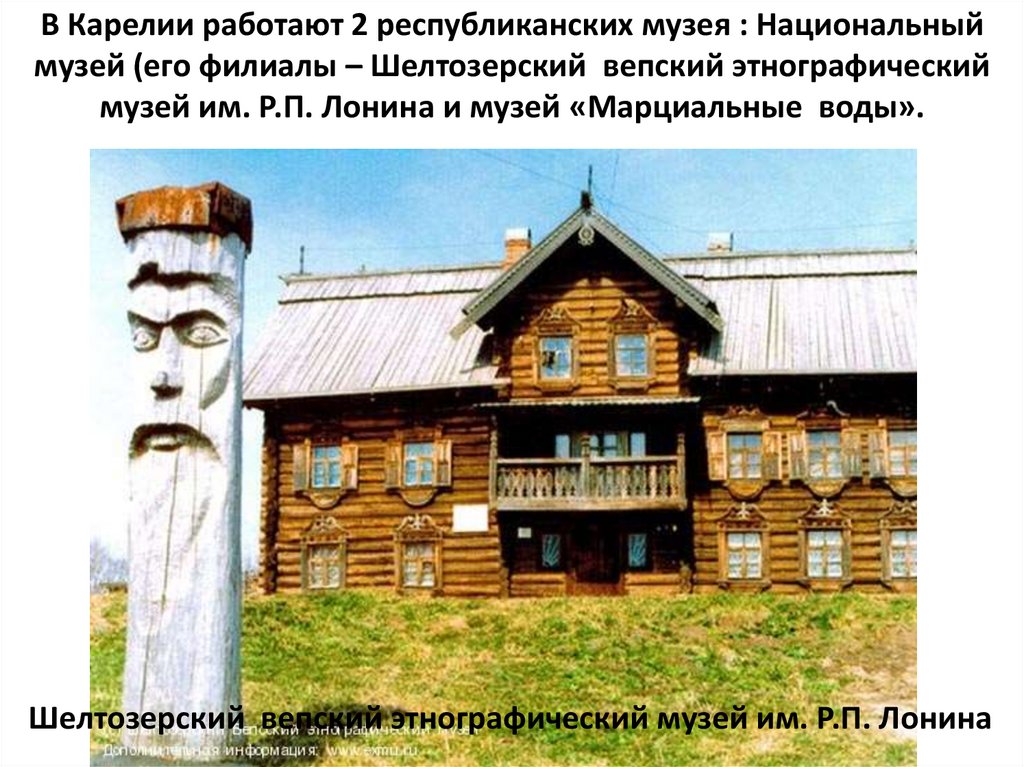 В Карелии работают 2 республиканских музея : Национальныймузей (его филиалы – Шелтозерский вепский этнографический