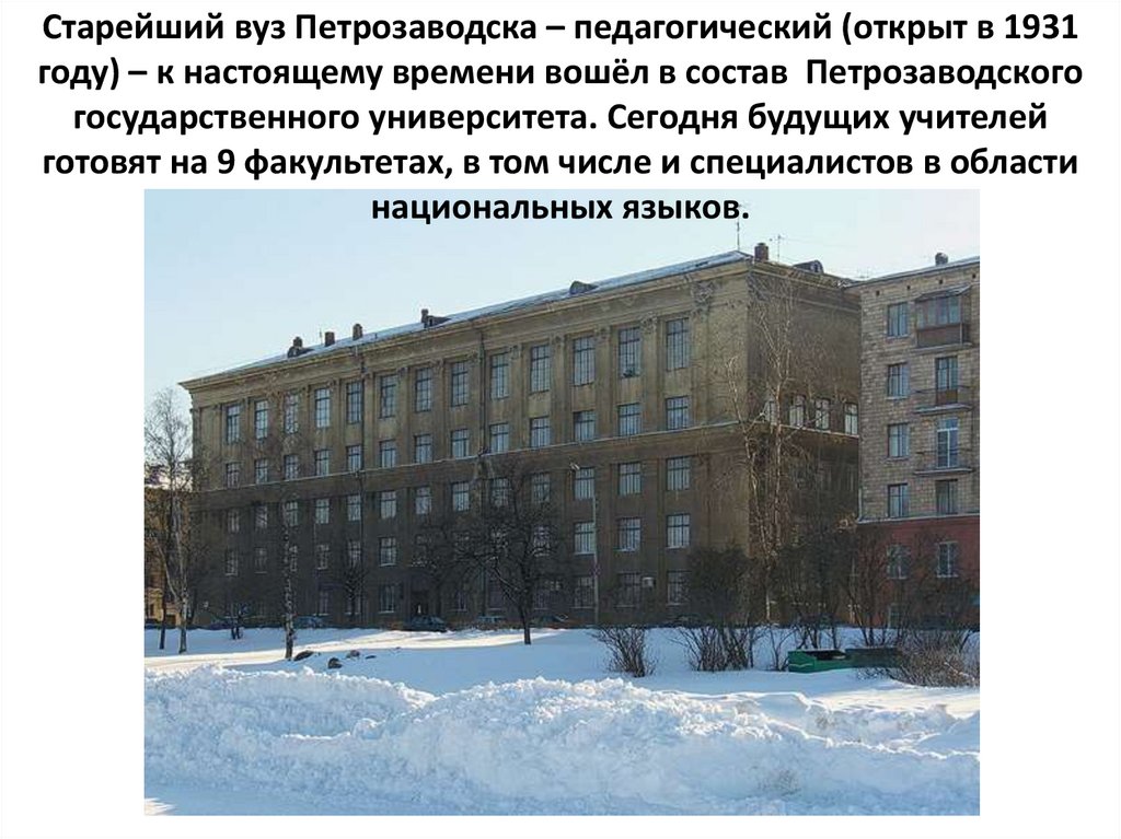 Старейший вуз Петрозаводска – педагогический (открыт в 1931году) – к настоящему времени вошёл в состав Петрозаводского
