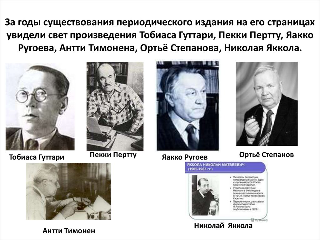 За годы существования периодического издания на его страницахувидели свет произведения Тобиаса Гуттари, Пекки Пертту, Яакко