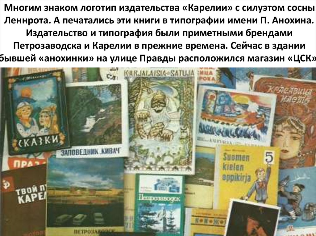 Многим знаком логотип издательства «Карелии» с силуэтом сосныЛеннрота. А печатались эти книги в типографии имени П. Анохина.