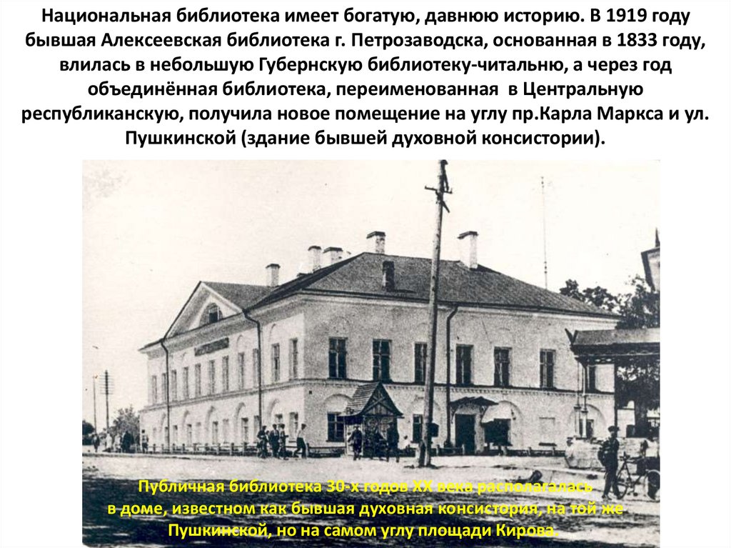Национальная библиотека имеет богатую, давнюю историю. В 1919 годубывшая Алексеевская библиотека г. Петрозаводска, основанная в 1833 году,