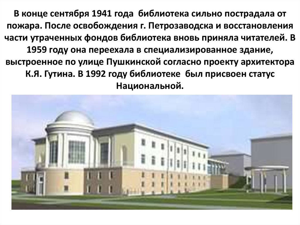 В конце сентября 1941 года библиотека сильно пострадала отпожара. После освобождения г. Петрозаводска и восстановления
