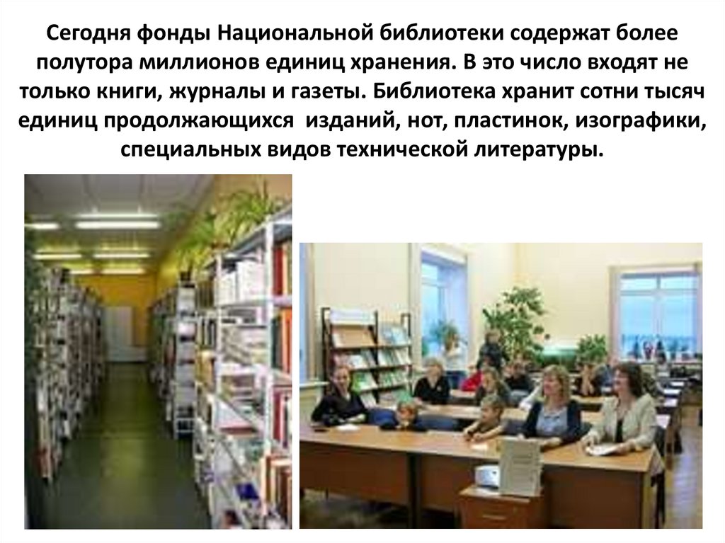 Сегодня фонды Национальной библиотеки содержат болееполутора миллионов единиц хранения. В это число входят не